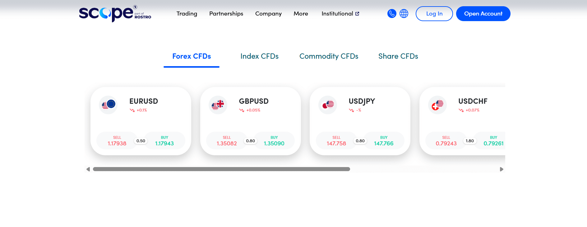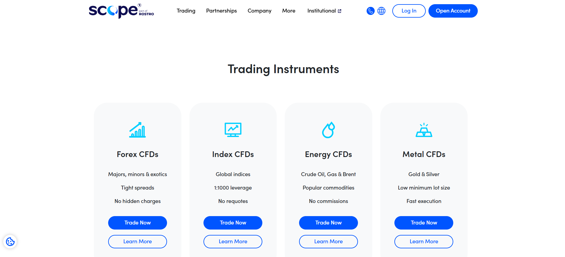 - Indices & Shares: CFD trading on global indices and stocks is available. The Scope Invest account offers fractional stock CFDs (as little as 0.01 lots) with 1:1 leverage and zero commission. Share CFD spreads start from 0.1 pips for Index CFDs on MT5.